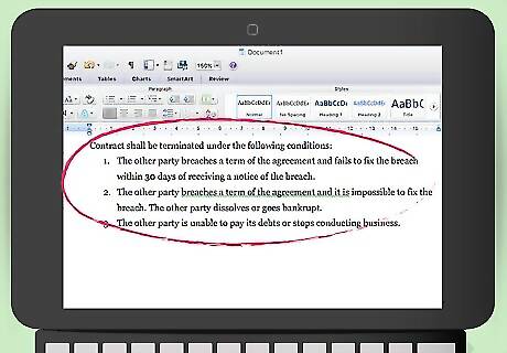 Identify what actions can trigger termination for cause. Either you or the reseller might want to terminate “for cause” when the other party breaks the agreement. You should identify the events that can trigger a termination for cause. For example, you might want to include the following: The other party breaches a term of the agreement and fails to fix the breach within 30 days of receiving a notice of the breach. The other party breaches a term of the agreement and it is impossible to fix the breach. The other party dissolves or goes bankrupt. The other party is unable to pay its debts or stops conducting business.