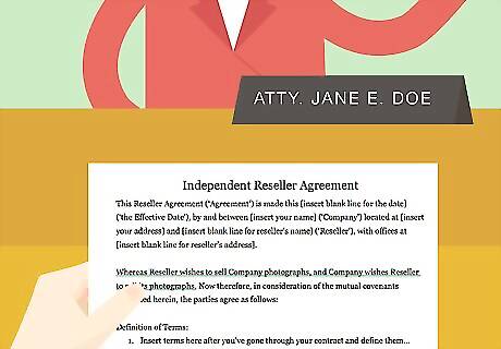 Show your agreement to a lawyer. This article describes a basic reseller agreement. It might not work for everybody. Depending on your needs, you may need to add or revise the agreement. You should show it to a lawyer and ask if you should change anything. To find a qualified attorney, you can contact your local or state bar association and ask for a referral. Also ask other photographers if they have used a lawyer. If so, get the lawyer’s name and schedule a consultation.