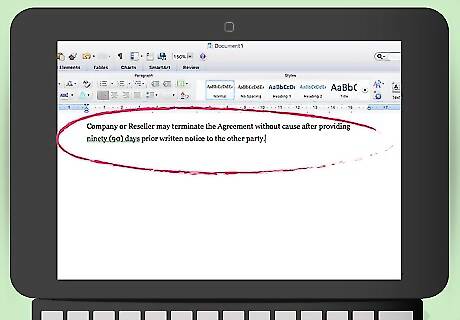 Identify how to terminate the agreement without cause. Sometimes people want to end their contracts early. You can include a provision stating when either you or the reseller can terminate the contract without having to give a reason. You might write, “Company or Reseller may terminate the Agreement without cause after providing ninety (90) days prior written notice to the other party.”