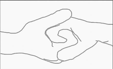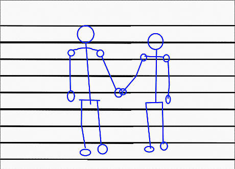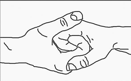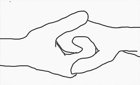 Draw their hands like overlapping mittens. Don't forget to show A's thumb over B's palm.
