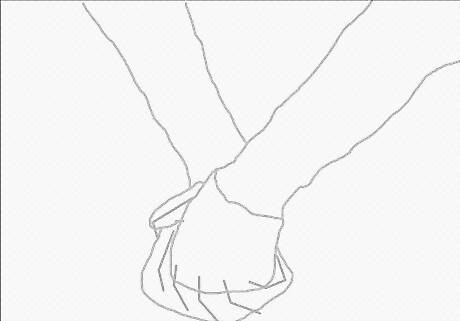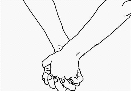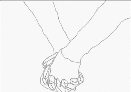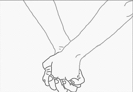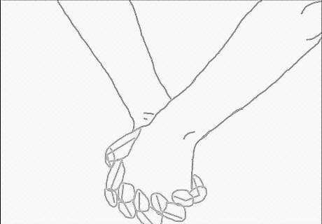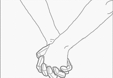 Draw the hands. Draw the leftmost person’s hand in front with his/her thumb wrapped around the other’s hand. Show how their fingers intertwine. The next section of this article has step by step instructions for drawing just the hands if you need it.