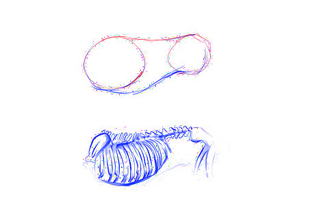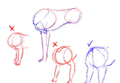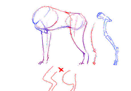 Draw the hind legs. The upper leg down to the heel has a smooth curve, which makes sense if you look at the skeletal structure of the hind leg. You can see that the femur is softly bent.