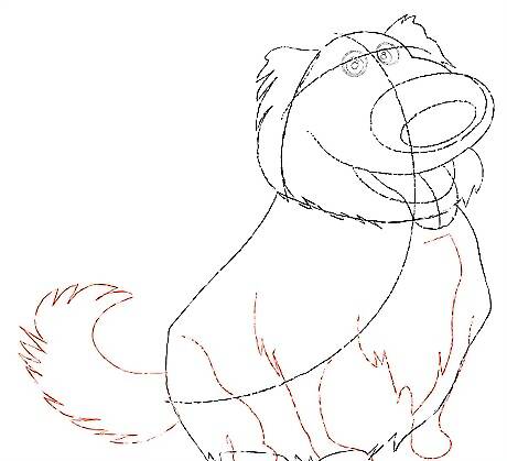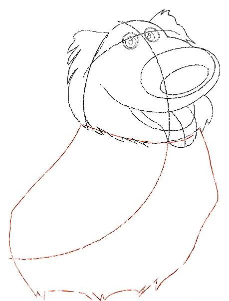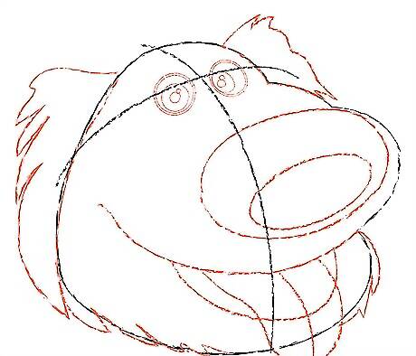 After drawing his head, begin drawing his body. Draw and bumpy shape below his head and add in zigzag lines to highlight some fur in his body. Draw a curve line as a guideline for his body.