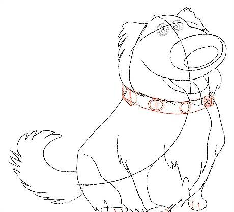 Draw his talking neck collar and some lines on his feet to finish of sketching him.