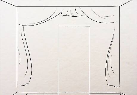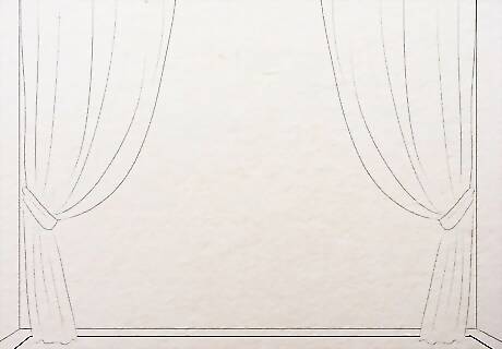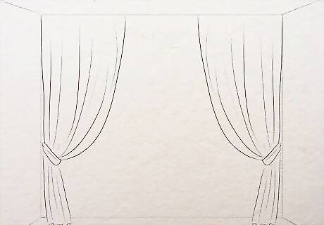 Add curtains. Make a 3 shape at the extreme left of the drawing for curtains. Make both the top and the bottom end open. Add a flair at the lower half. Add a band or a tie up look with double lines at the middle of the curtains and then make a bow shape with the loose ends hanging down. When you add the tie up or any other pattern to fasten the curtains at the center, make the curtain narrow down at that point. Make some lines of shading starting right where the curtain is tied up (the center). Remember that the lines will be closer and clustered near the tie up and will become broader as it reaches out. Do it on both half of the curtain. Make both the curtains likewise and color it in a bright yellow, fuschia pink, lime green or any other color you like.