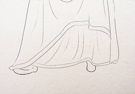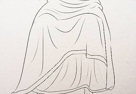 Start the lower half. Draw two stretched outlines for the robe around the legs. Since the position is sitting, it is going to look like so with lines and shading. Draw some curved sleeping lines to show the legs in the sitting position. Extend the robe further below and make the lines in a more wider as it reaches the hem or the feet. Make the hem wavy or you can show a pleated or folded look with box-like pattern drawn near the hem.