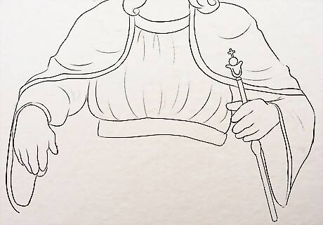 Make the throne. Start with the handle of the throne. You can give the shape of your choice to the handles. Just follow the palm and make double lines to whatever design you chose. You can make a double S shape which gets thinner at the end and make small shapes of design on it. Not much of the throne needs to be visible as Jesus will be having most of it covered. Only the handle, legs of the throne and small portions of the backrest might be visible. Make feather-like shape for the backrest. Try to make it beautiful using a clear outline, borders on the top and then some pattern on it. Color the borders with golden or any shimmery colors.