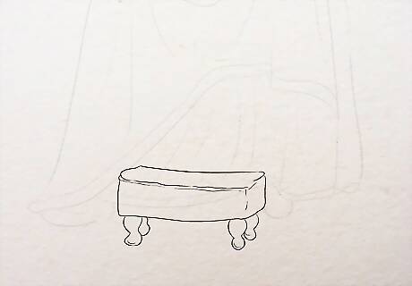 Complete the footstool. Draw three legs. The second leg to the left may not be visible based on how it is positioned. Make double-lined legs. You can make the legs simple or make them in a different shape with wavy lines with floral cushion etc. Show depth by drawing a line going up from the right side of the footstool. At the end of it, draw a leg. The leg at the back tends to be smaller in pictures. So draw that one smaller and slightly higher than the front one.
