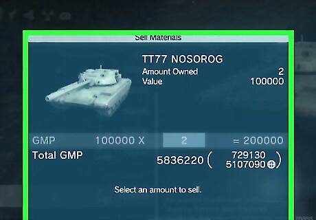 Sell off surplus vehicles and resources for GMP. Although vehicles can be used for missions, it’s best to sell them off for GMP. Open up your iDroid and sell your surplus tanks, walker gears, placeable weapons (anti-air gun emplacements), and other resources from the Resources option under the Mother Base tab. Selling a tank will net you 50000 GMP while Walker Gears can fetch up to 70000 GMP. Trucks and jeeps can be sold for about 20000–50000 GMP (depending on the model) but are also easy to find in bases and outposts in both Angola-Zaire and Afghanistan (compared to tanks and Walker Gears). Resources are a bit iffy to sell off because they’re important for developing platforms on Mother Base as well as Venom Snake’s weapons and equipment. It’s recommended that you sell them off only when you’ve constructed all of your Mother Base’s platforms.
