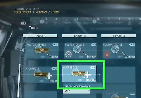 Level up your Fulton Recovery System to Cargo +2. After Episode 2 of the main story mission, Revolver Ocelot will introduce you to the Fulton Recovery System. Use this to extract as many personnel for your R&D team as possible so that you can get the Cargo +2 upgrade. The Cargo +2 Fulton upgrade will also require that you extract the Transportation Specialist found at Lamar Khaate Palace (Episode/Mission 10).