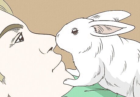Try some nose nuzzling. Even once your rabbit is comfortable around you and will come out to greet you, they may be startled by your hand movements. If this seems to be the case, lie on your stomach with your hands at your sides or on your back. The rabbit may approach your face. Hum softly and lowly, to mimic friendly rabbit communication. Your rabbit may even rub their nose and cheeks against your own.