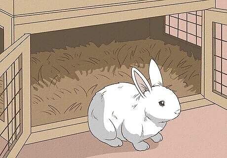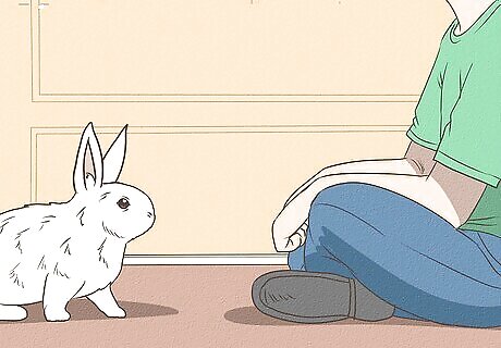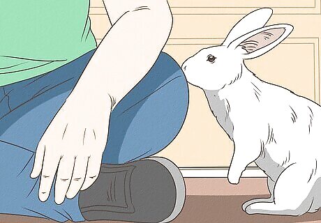 Let your rabbit come to you. After opening the hutch, take a few steps away. Lie or crouch on the floor away from the hutch. Wait for your rabbit to approach. Stay calm, as your rabbit may sense your frustration or impatience and become frightened. Rest assured that your rabbit’s curiosity will cause them to come say hello.
