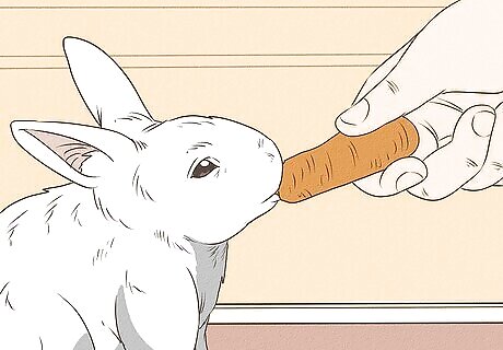 Offer a treat. To motivate the rabbit to come out and spend time with you, offer a treat. Place the treat in the palm of your outstretched hand. Go with small pieces of carrots, apples, or bananas. A pinch of oats may also be enticing to your rabbit. Veggies and fruits should not amount to more than 10% of the rabbit’s total diet. Rabbits should eat mostly hay. Never feed your rabbit anything with chocolate, caffeine, or high amounts of sugar or fat.
