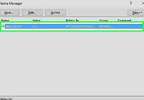Click Name Manager. It’s near the center of the ribbon at the top of Excel. A list of named ranges will appear.