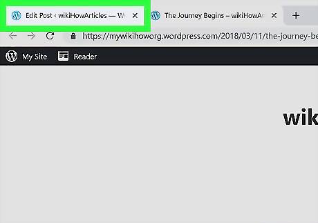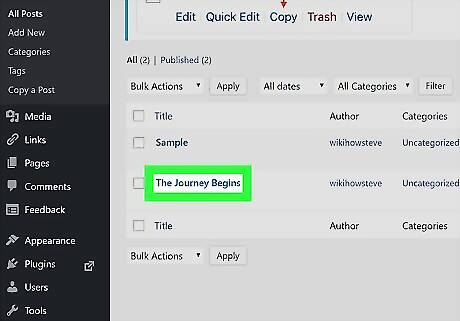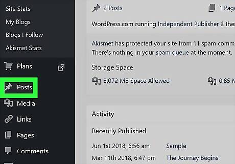 Click on Posts in the side menu. From the website’s dashboard, you will see a menu on the left side of the screen. It has a black background and a list of options in grey text. The “Posts” option has a thumbtack icon to the left of it. Clicking on this will take you to your list of posts. If you don't see "Posts," click on "Site" and a drop-down menu should appear. You should find "Posts" near the top of the list. Depending on the type of WordPress blog you have, this might be labeled "Blog Posts" or "Site Pages" instead of "Posts."