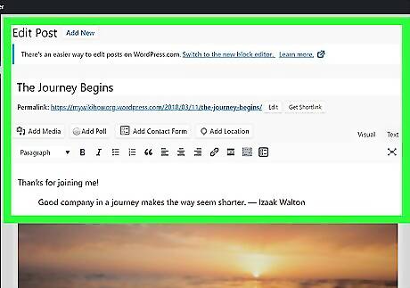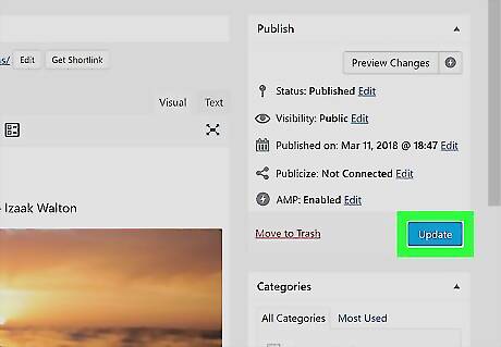 Click on the information you want to change to edit it. The “Edit Post” page gives you the power to change most of the text and visuals on the page. Click on the text and type in your changes to edit the post. To change the title of the page, simply click on the text box with the title in it and type in the new title. If you want to change the post URL, find the “Permalink” right beneath the post title. Click on the “Edit” button next to the URL, type in any changes, and click “OK” to save it. To edit the post's featured image, look for the "Featured Image" box on the right side of the page. Clicking on the current image will bring up your media library where you can pick from a gallery of images. Alternatively, you can click "Upload Files" to upload a new image. Once you have selected a new picture, click "Set featured image" in the bottom right corner of the window. If your website uses categories or tags, you can also edit those by finding them on the right side of the page. Under "Categories," simply click the check mark next to the categories you want this post to appear under. Under "Tags," type in the words or phrases you want to associate with the blog post and then click "Add."