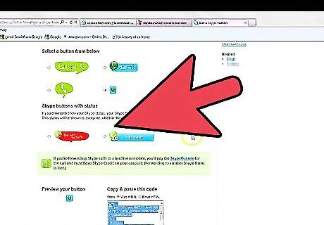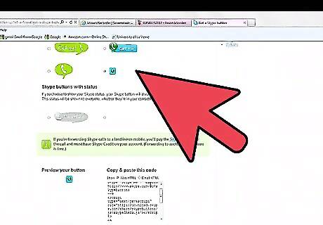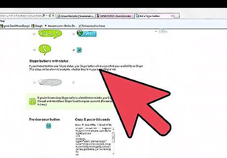 Customize your Skype button. You need to put your Skype username and select different appearance settings to generate the code for your button. Click on the required field below the title “Enter your Skype Name” and type your Skype username there. Mark one of the boxes “Call” or “Chat” or both to indicate the option of communication. Your selected option will be shown on your Skype button. Through selecting the “Call” option, people can call you with a click only. Using the “Chat” option will allow people to start a conversation with an instant message. Click on the drop-down “Blue” menu to select your preferred Skype button color. The default color is blue, but you can also choose “White” for your button. Just click on the color to set it. Remember, your Skype button background is transparent, so you can place it on any color or background. You should see the preview of your button on the right corner of your page. Click on “32px” that appears to see the drop-down menu of different pixel sizes of your Skype button. There are different sizes from 10px to 32px. You can choose one of them. The default size is 32px. Check the preview of your customized button on the right corner of your page.