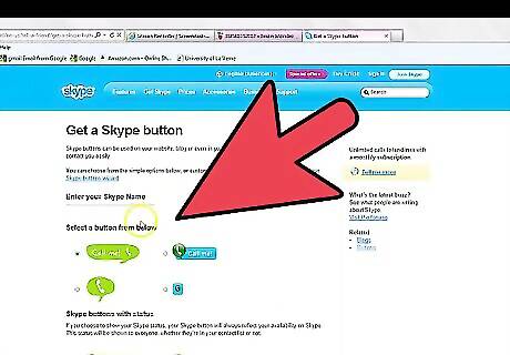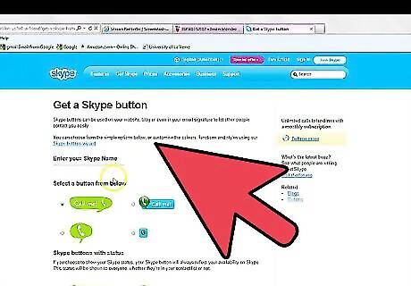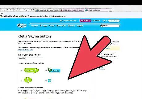 Visit Skype's button generating page. Go to http://www.skype.com/en/features/skype-buttons page to generate your Skype button and use it on your web pages to help people contact you through voice calls or instant messaging easily. You can embed this button using the self-generated HTML code of Skype. Your visitors will see a Skype icon with the word “Call”, “chat” or both.