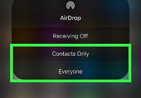 Tap Contacts Only or Everyone. Choose Contacts Only to share files only with your contacts, or Everyone to share with people you haven't yet added. To disable AirDrop, tap Receiving Off.
