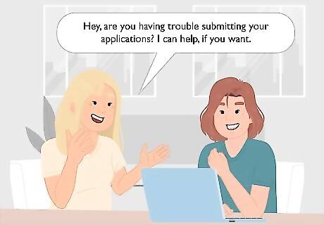 Ask them if they need help with the job search. Some people may not know how to properly submit their resume, cover letter, or how to look for a job online. If this is the case, ask the person if they need help applying to jobs. If they do, walk through the application process with them so that they know how to do it in the future. Say something like, "Hey, are you having trouble submitting your applications? I can help, if you want." Some people may be reluctant to ask for help, which is why asking is important.