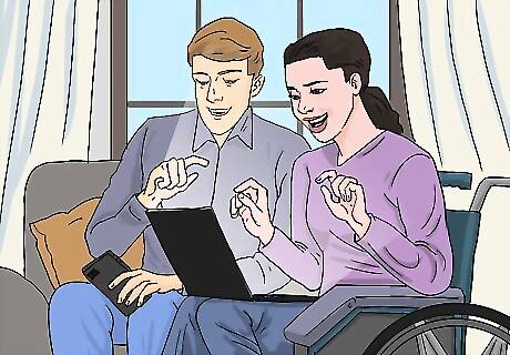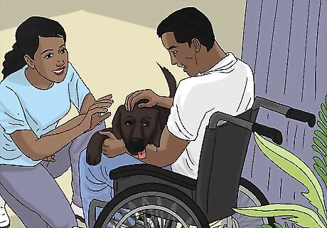 Find a pet for them, if they are interested. Pets can be great companions. It is important to choose a type of animal that the person likes, and that they are able to look after given their disability. Having a pet (or anything to look after — even a garden!) can contribute to one's sense of responsibility, and overall happiness and wellbeing. Pets have been shown to improve the mental health of people living alone. In studies of how people relate to dogs, for instance, it has been shown that having a dog increases your levels of oxytocin, which is commonly known as the "love hormone" (it gives you that great feeling when you hug, cuddle, or kiss someone, or otherwise connect with a living being such as a pet). Some disabilities would also qualify people for a "service animal." Service animals are specifically trained to help with the given disability, such as guide dogs for people who are blind. Service animals are also available for people who are diabetic, autistic, epileptic, or suffer from severe anxiety, among other things. If your loved one's disability qualifies them for a service animal, look into this option as well — it provides not only companionship, but also assistance moving through the world in a functional way.