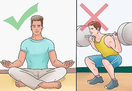 Opt for a less vigorous workout. A low-intensity exercise may be more beneficial if you're fasting. This may help ensure that your body doesn't use protein for fuel. During a fast, your body relies on stored energy in the form of glycogen (your body's storage form of glucose). If you haven't eaten in awhile, you may be running low on glycogen which will force your body to use protein as fuel. Choose exercises like walking instead of running. Moderate walking is a low-intensity way to stimulate your heart rate. Do light yoga or Tai Chi. Slow, deliberate movements not only balance and stimulate the body, these ancient practices have been known to calm and clear the mind. Garden or do light yard work. They require bending, stretching and lifting, among other body movements. Both are basically exercise disguised as a hobby or a fun chore. If at any point, even during low-intensity physical activity, you feel lightheaded or dizzy, discontinue the exercise immediately. You may need to drink water and eat a small meal to help you feel better.