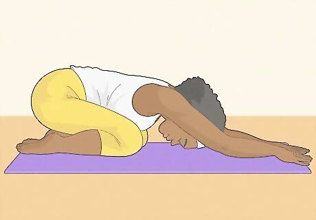 Perform yoga on days you feel sluggish. Gentle, stretching yoga exercises may provide relief while allowing you to build strength and flexibility. Avoid twists and inversions, as these may be uncomfortable on your period. You can try: The child pose: sit on your knees and slowly bend forward until your forehead touches the floor. Extend your arms in front of you and rest for ten seconds. Cat pose: crouch on all fours, arch your back, and tuck your head. Hold for a few seconds and breathe. Knee-to-chest pose: lie on your back and bring your knees to your chest, hugging your calves with your arms.