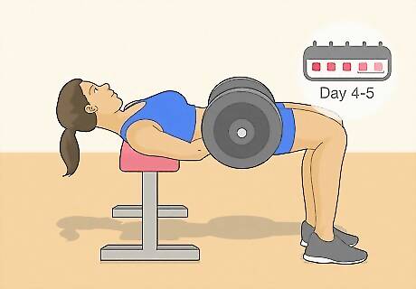 Start lifting weights towards the end of your period. As your period ends, you may feel stronger or more tolerant of pain. This is a great time to do strength training. Go through your regular weightlifting routine, or do a bit of leg and arm work. You can continue to get the benefits up to a week after your period ends. If you don't normally lift weights, try starting out on the weight machines at the gym. Try the leg press, the lateral pull down machine, or the shoulder press. A floor press is a good exercise for your period. Hold a dumbbell in each hand. Lie on your back with your knees bent and your feet together. Start with your elbows bent against the floor and slowly raise them until your arms are straight. Do two or three sets of eight to ten reps. Avoid any moves that put strain on your stomach or back, as these may be more uncomfortable during your period.