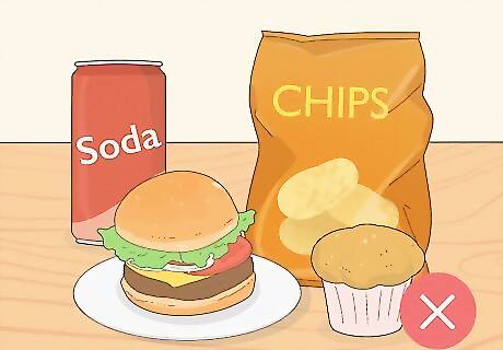 Avoid fatty, sugary, or salty foods. These foods can make you bloat, and they may worsen cramping or back pain. Avoiding these foods may also help you reach your workout goals faster. On your period, stay away from: Baked goods like donuts and muffins. Processed snacks like chips and crackers. Fried foods like french fries. Soda.