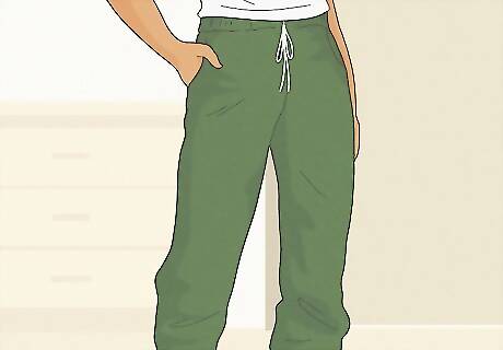Wear dark, loose-fitting clothing. Pants and shirts that are too tight might cause discomfort, especially if you’re experiencing cramps, constipation, or bloating. Instead, choose looser clothing. Make sure that your pants are dark, just in case there’s a leak! For example, instead of tight leggings, wear loose sweatpants to the gym. A cotton t-shirt or tank top is perfect, especially if you don’t tolerate heat well on your period.