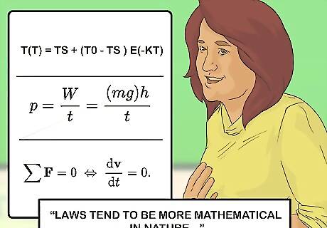 Define a scientific law. This is a complicated concept and tends to confuse students. Laws tend to be more mathematical in nature and are usually derived from simple statements about mathematical systems and their behaviors. Explain that, like a theory, a law can also be used to make predictions, but the primary purpose of a law is to describe natural phenomena. Some scientific laws include: Newton's Law of heating and cooling: the change in temperature of two bodies in thermal contact is proportional to their difference in temperature. Newton's Laws of motion: statements about how large objects made of atoms behave when moving at low speeds relative to each other. The Laws of Thermodynamics: statements about entropy, temperature, and thermal equilibrium. Ohm's Law: the voltage across a purely resistive element is equal to the current through the element times its resistance.