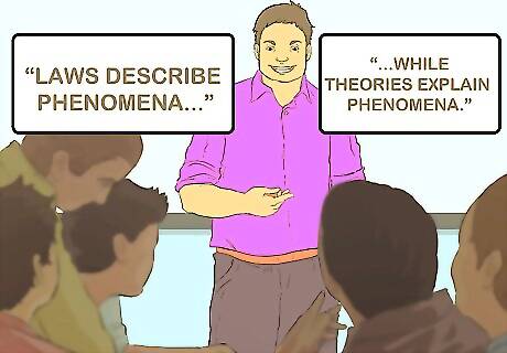 Clear up any common misconceptions. Many students and adults hold to misunderstandings of scientific vocabulary and misunderstand the relationship of theories, laws, and facts. For example, scientific theories do not develop into scientific laws. To explain the difference, focus on this distinction: laws describe phenomena, theories explain phenomena, and facts describe observations.