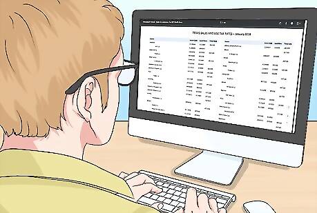 Identify the city and county taxes for your location. The comptroller's office has a number of tax tables on its website that will let you know what local taxes you must pay based on where your business is located. If you have more than one location, you may have more than one tax rate. Make sure you look up the rates for all locations. The Comptroller's Office has an online rate locator that you can use to easily find the combined sales and use tax rate for your business. Enter your business's address at https://mycpa.cpa.state.tx.us/atj/ and click "Search."