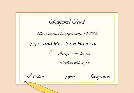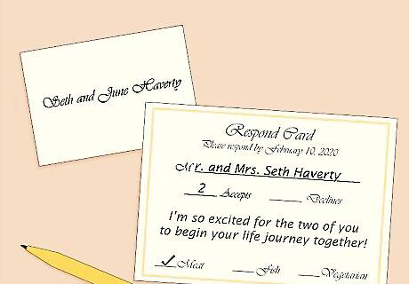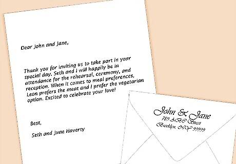 Follow the host’s preferred response method if there’s no card provided. Some couples will opt to take RSVPs through an online portal on their wedding website or request replies via email. Read their instructions carefully and reply according to their stated preference. Responding in a non-preferred method will add unnecessary stress to planning their wedding. Remember to look for (and adhere to) the “reply by” date—the sooner the better! When sending an email RSVP, write in a formal tone and be clear about who can and cannot attend and their preferred entree preferences (if the instructions request specification). For example, your email could say: “Dear Marcus and Jessica, thank you for inviting us to take part in your special day. Leon and I will happily be in attendance for the rehearsal, ceremony, and reception. When it comes to meal preferences, Leon prefers the steak and I prefer the vegetarian option. Excited to celebrate your love! Best, Andra and Leon Mercer.” If you cannot attend, don’t make excuses or go into details. Keep it brief and cordial. For example, you might write: “Dear Marcus and Jessica, we’re honored to be invited to your wedding and rehearsal. Regrettably, Leon and I will not be able to attend either event. We wish you both the best on your special day! Warm regards, Andra and Leon Mercer.”