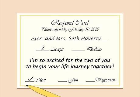 Indicate the number of attendees and absentees. Most cards will have two lines for you to fill in. The text next to each line will read “accept” or “decline” or something like “accepts with pleasure” or “declines with regret.” If you are filling out the card for yourself and others, write the number of attendees and absentees on the provided lines. For example, if your family of 3 was invited but only you can go, write a “1” on the accept line and “2” on the decline line.