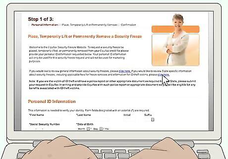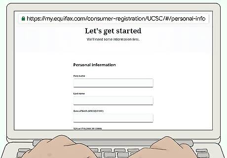 Create an online account to freeze your report online. The quickest and easiest way to freeze your Equifax credit report is to set up a free online account with Equifax. Go to https://my.equifax.com/membercenter/#/login and click the link to "Register Now." A basic account is free. However, you will have to answer a few questions to verify your identity. The questions are based on information provided in your Equifax credit report.