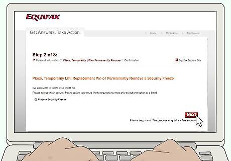 Follow the prompts to remove your freeze online. If you have an online account with Equifax, log in at https://my.equifax.com/membercenter/#/login and click the link to manage your freeze. From there, you'll be able to permanently remove the freeze. Even if you don't have an online account with Equifax, you can set one up if you want to remove your freeze online. You'll just have to answer a few questions to verify your identity. The questions relate to information found in your Equifax credit report.