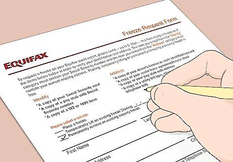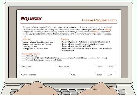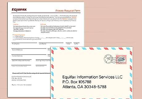 Fill out the form to place a freeze by mail. Equifax also gives you the option to print a paper form, fill it out, and mail it to Equifax. You can download the form at https://assets.equifax.com/assets/personal/Security_Freeze_Request_Form.pdf. The form must be accompanied by documents that verify both your identity and your place of residence. If you've recently moved or changed your name, you may need to provide additional documents to verify your identity. When you've completed the form, mail it to Equifax Information Services LLC, P.O. Box 105788, Atlanta GA 30348-5788. This address is also listed on the form.
