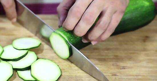 Slice or shred the zucchini. Determine which form you plan to use the zucchini in. Process the zucchini in that form to prepare it form blanching and freezing. Use a sharp knife to remove 1/4 inch (6.35 mm) from each end of the zucchini. If slicing the zucchini, use a knife to cut the remainder of the vegetable into 1/2-inch (1.27-cm) thick slices. If cutting the zucchini into small cubes, begin by first cutting the zucchini in half lengthwise. Remove the seeds with a metal spoon and cut the vegetable into cubes. If shredding the zucchini, use a box grater to grate the remainder of the zucchini into fine shreds. You could also use a food processor to coarsely chop the zucchini into shreds.