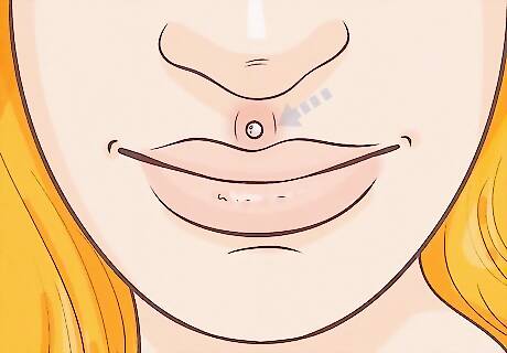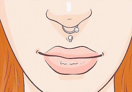 Decide if you want to incorporate other piercings. Medusa piercings are usually a single piercing. However, some people enjoy adding other piercings to a medusa piercing to add variety. It's often paired with other piercings of the lip or nose for a striking look. For example, some people prefer to pair a medusa piercing with an additional piercing on the upper lip itself, near the center. The end product is a piercing that makes two dots running down your mouth. Other people enjoy pairing a medusa piercing with a nose ring. Septum piercings, in particular, are popular to pair with medusa piercings. If you have existing piercings, think about how these would look with a medusa piercing before committing to one. You want to make sure a medusa piercing blends easily with the rest of your style.