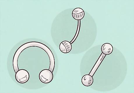 Choose your jewelry type. Only hypoallergenic jewelry made from surgical stainless steel, gold, platinum, niobium, or titanium should be used. Traditionally, studs or balls are used in medusa piercings. However, some people do use hoop jewelry instead. You can choose whichever you prefer. In addition to the type of jewelry you choose, think about the colors or materials you prefer. For example, if you wear a lot of colorful outfits, you may want to go for a neutral-colored piercing so it will go with most of your wardrobe.