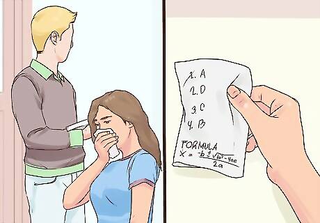 Deal with every scenario. Start sketching out different plans that address each way you could possibly get caught. You may not find one that addresses them all, but try for it, anyway. Decide on which plan is the most foolproof. Don’t discard the others, though. Keep them as backup plans in case Plan A falls through. If you’re skipping school, consider these different actions: asking your parents directly for a mental health day; faking an illness; calling the attendance office in the morning and posing as your parent before the school calls them; putting a show on for the neighbors by leaving for school and then running back home as if you’re sick. When cutting class, think about: only skipping classes during lunch periods when kids are allowed to leave campus; avoiding businesses and other public spaces; risking a write-up for being late to homeroom so you end up on the absentee roll. To cheat on a test, consider: using items that you are allowed (like tissues, beverage labels, or even your pen) to write or hide cheat sheets; writing answers on your skin and using clothes to hide them; training beforehand to read cheat sheets quickly while the teacher’s back is briefly turned; training with your friends so everyone is comfortable.