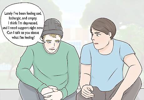 Have an honest talk about your mental health with a trusted friend or relative. Talking about your mental health can be really hard, especially if you’re worried people will judge you. However, your mental health is just as important as your physical health, and you deserve to get the care you need. Discuss your symptoms and how they’re affecting you with someone you trust. Ask them to support you and be there for you when you need to talk. You might say something like this: “Lately I’ve been feeling sad, lethargic, and empty. I think I’m depressed, and I need support right now. Can I talk to you about what I’m feeling?”