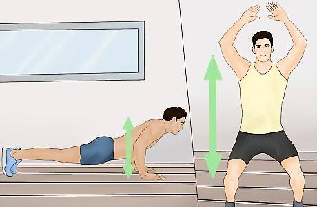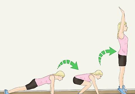 Try burpees. Burpees are a great high-intensity full-body combo exercise. They work muscles in the legs, arms, and core. Burpees offer strength training and cardio, and they are considered high intensity moves, perfect for a short workout. Start with your feet shoulder-width apart. Bend your knees into a squat position. Then bend at the hips and put your hands on the floor. Push your legs straight back and end in a plank position. Jump forward so that your feet are back under you and you are in a crouching position. Straighten yourself as you go into a squat. Jump up with your hands above your head. You can add a push up to the burpee for additional intensity.