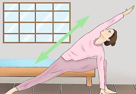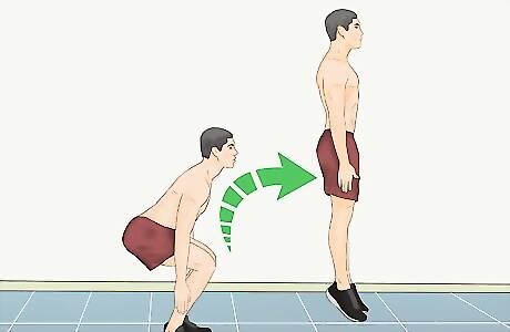 Do a squat jump into a lunge. Work on pushing yourself and incorporating the whole body by doing a squat jump then going immediately into a lunge. Start by lowering into the squat position. When you are there, push through your hips and drive through your heels as you jump up in an explosive movement. Make sure to jump as high as you can. Land with your knees bent and continue back down into the squat. Then, go immediately into the lunge by putting your right leg in front of you, bending at the knee. Then, lunge with the left leg. This is one rep. Make sure to stay in proper lunge and squat form. Your knees should never get in front of your toes and you should keep your weight in your heels. Try doing 10 to 12 reps in 8 sets. You can also combine this with other full body workouts into a short 10 to 15 minute workout. You can do this with hand weights to add some arm work to the exercise.