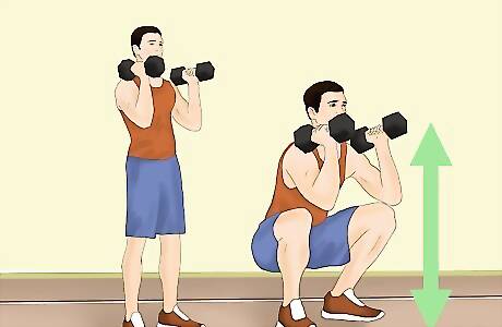 Perform a squat into a bicep curl with an overhead press. To perform this exercise, start by doing a squat with hand weights. Your feet should be shoulder-width apart as you go into a low squat, holding your dumbbells low. Straighten up with your arms bending into a bicep curl. Lift the weights toward your chest by bending at the elbows and bringing your weights towards your chest. Your wrists should be near your shoulders, your elbows by your side. Then perform an overhead press at standing. Extend your arms straight up in the air, following a straight line from your elbows through the wrists and hands and up to the ceiling. Lower back to a squat, lowering your arms back into a bicep curl, and then fully extending the arms at the bottom of the squat. Try 10 to 12 reps, for 5 or 6 sets.