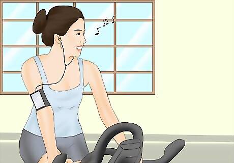 Create a high-energy playlist. Music is a great motivation for working out and moving faster. For short workouts, music can be a great push to work harder for that short duration. Depending on the workout, you may listen to a song or 2 and be done. Put together a playlist of songs that make you want to get up, move, and push yourself to your limit. For example, you may choose music with fast tempos, songs that make you happy or excited, or songs that make you feel like you are strong and invincible.