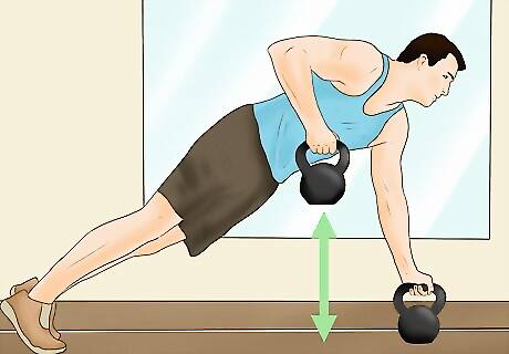 Do a plank row. Plank rows can be great for intense, full body exercise. For a plank row, you should use hand weights. Get into a plank position, holding the hand weights in each hand. Position your hands on the ground under your shoulders. Lift one arm as you draw your elbow towards the ceiling. The hand weight should be pulled to chest-height. Lower the weight back to the ground and repeat with the other arm. Try to keep your core stable. Your arms should be the only thing moving. To add one more motion and increase the intensity, after you’ve lifted the hand weight with each arm, push yourself into a downward dog position. Try 8 to 10 reps for 3 sets.