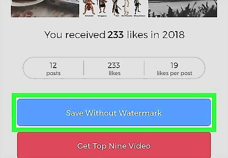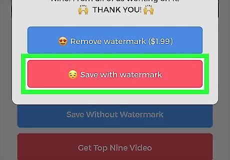 Tap the red Save with watermark button. This will save the picture to your Camera Roll with a semi-transparent "TOP NINE" watermark on it. Alternatively, tap Remove watermark in the pop-up to purchase the app's premium subscription. This will allow you to save your top-nine grid without a watermark. If you're prompted to allow the app access to your photos, tap Okay, got it!, and then select OK or Allow.