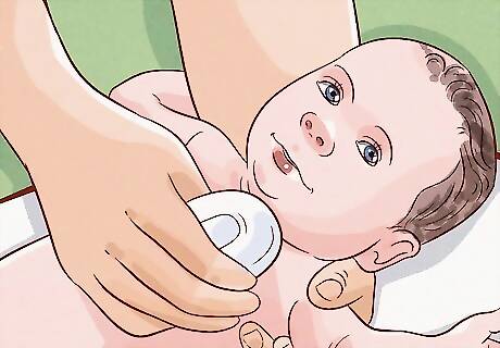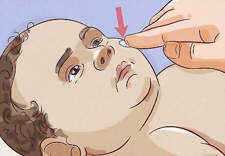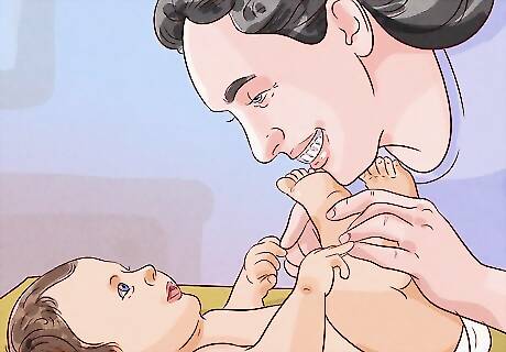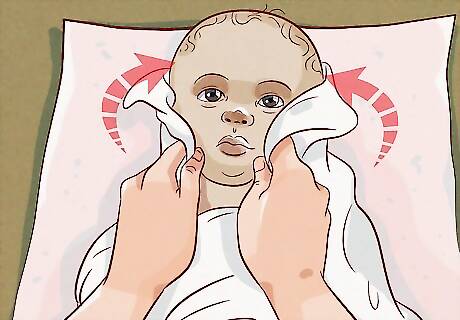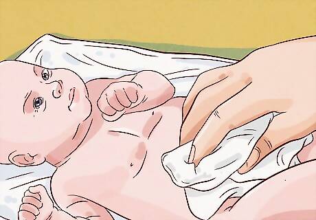 Wash around your baby’s umbilical cord stump, if they still have one. It's important to keep the skin around the umbilical cord stump clean so your baby doesn't develop an infection. However, try not to get the stump wet, as you want it to dry up and fall off. Use your washcloth to gently clean the base of the umbilical cord. As you clean around the belly button, don’t pull on the umbilical cord stump. It will fall off on its own. If the stump gets wet, pat it dry with a towel, then fold the top of the baby’s diaper down until it air dries.